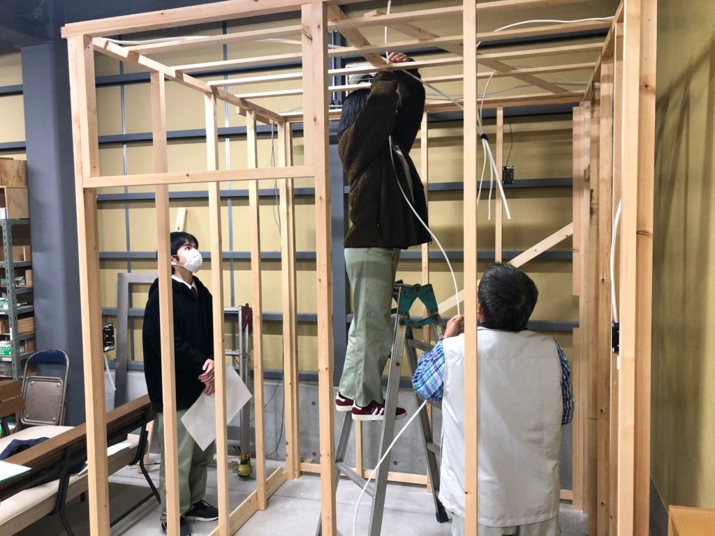 初日は、図面を見ながらの配線作業を行います。配線作業は久しぶりだったようで少し手間取っていましたが、すぐに慣れてきて作業のコツをつかむのも早かったです。学校では机の上での作業ですが、器具の取り付けをする高さに気を付けるなど、『使う人の目線で』仕事をすることの大切さを学んでいました。