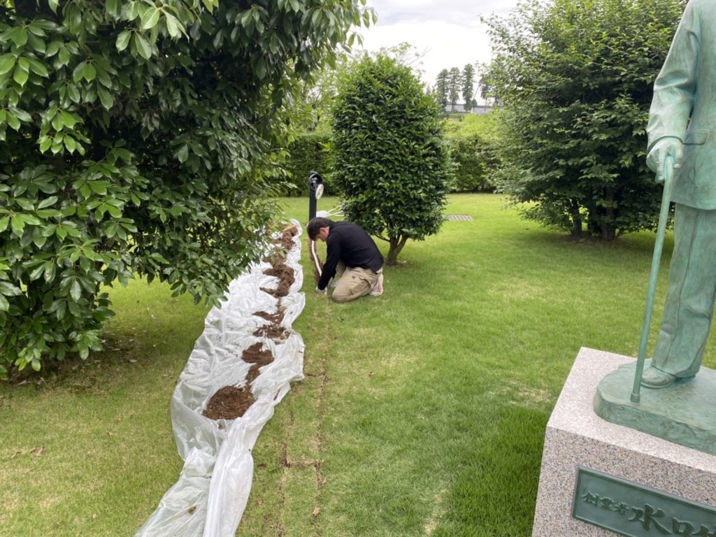 芝生の下の地中に電線を埋設して電気を通し、ライトで照らす工事を行いました。夜でもライトアップにより明かりが灯ります。